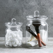 Simple bathroom storage with a stylish feel. Even if your bathroom is small, there are ways to make it at least appear larger. Here are a set of 2 jars with lids that could help improve the storage, style and look of the bathroom. Clean lines and classic styling make this collection a bathroom staple. Made of glass, they are just as functional as it is stylish. In addition, these jars are perfect for holding a variety of items, from candy and cookies in your kitchen to seashells in your living room. These decorative jars make a stylish addition to everything from wedding reception tables and candy buffets to kitchen and bathroom counters, and they're the perfect way to bring a touch of classic elegance to your living space.