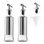 Glass bottle body and stainless steel material accurately fitted, beautiful and practical used for cooking and salad etc. The Soft leather ring, good sealing, unique anti drop oil leakage nozzle, accurate oil control. Provide a stainless steel funnel, easy to reuse. Transparent bottle bottom and bottle mouth design, you can see and control your oil volume clearly, Non-slip stainless steel bottle body and lead-free glass material, ensure the health of you and your family. The type of curving spout design, easy to control the amount of oil.