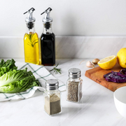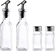 - This Combo Set includes: 2 pcs 6.3 oz oil and vinegar bottles, 2 pcs 2.3 oz salt and pepper shakers, 1 extra free pour spouts and 1 extra complimentary silicon funnel.