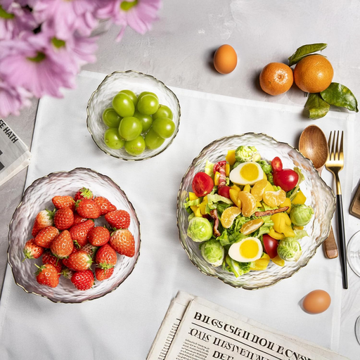 Afficher tous les détailsElegant Textured Glass Bowls with Gold Rim: This glass bowl set features a hammered finish and hand-applied gold trim, with a petal-shaped edge tha...